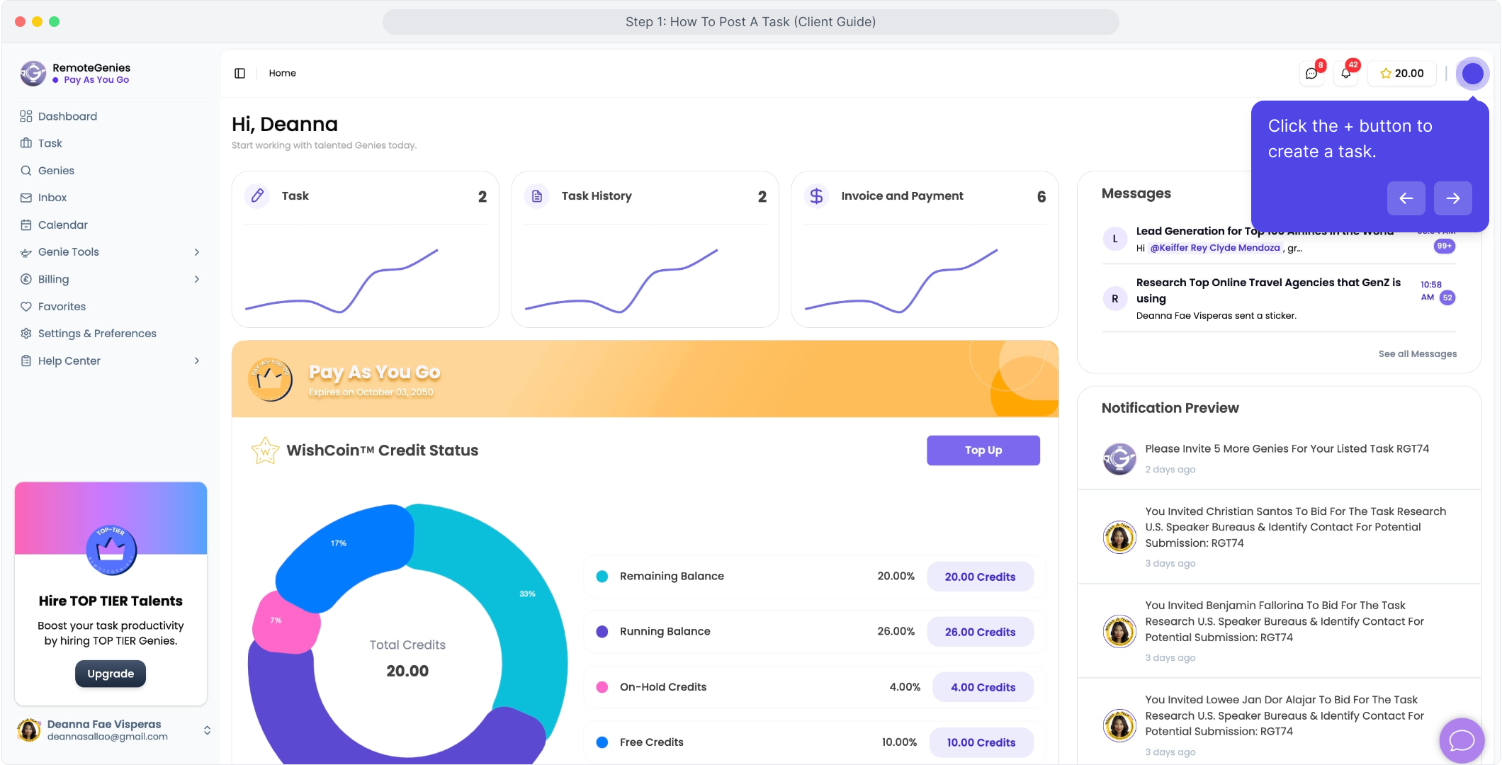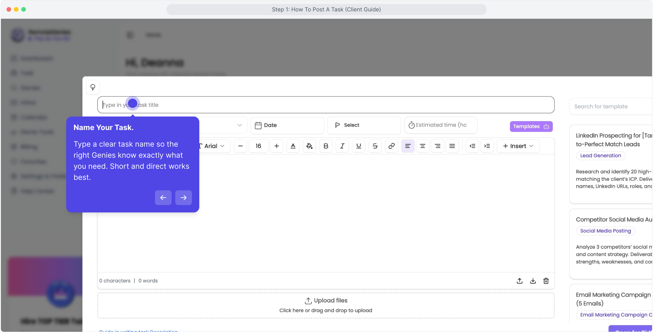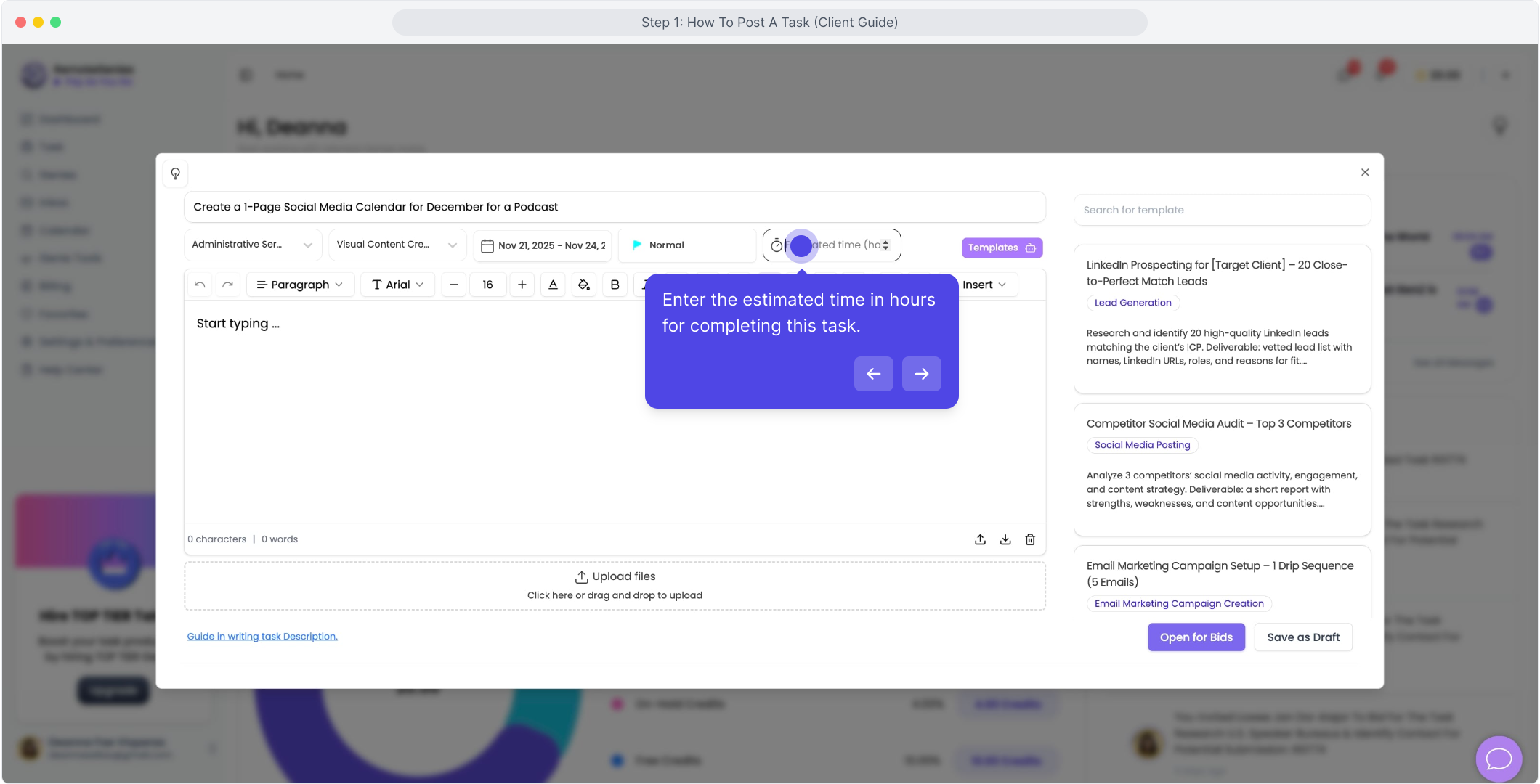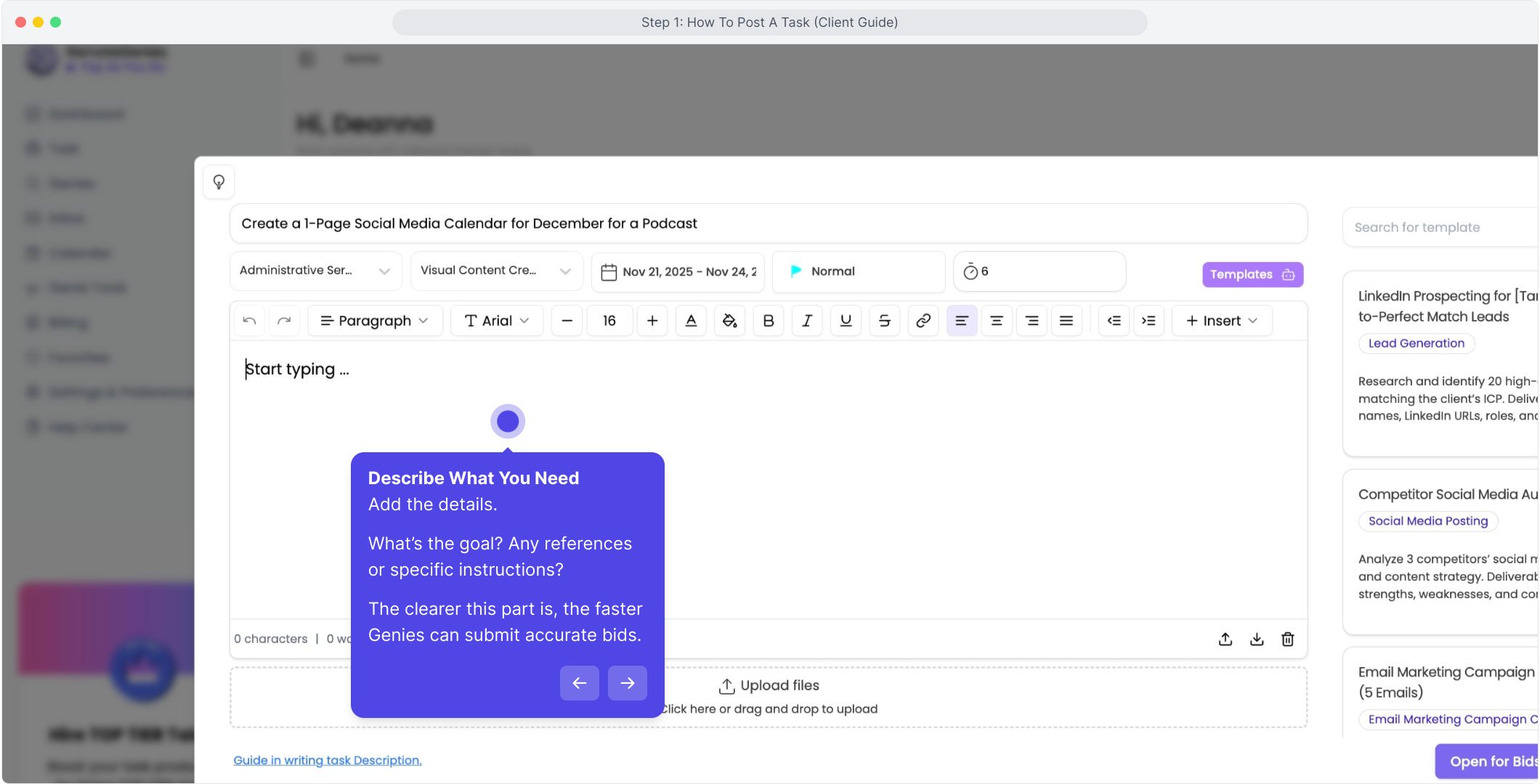- Once you click Open for Bids, your task becomes visible to relevant Genies and youβll start receiving proposals.