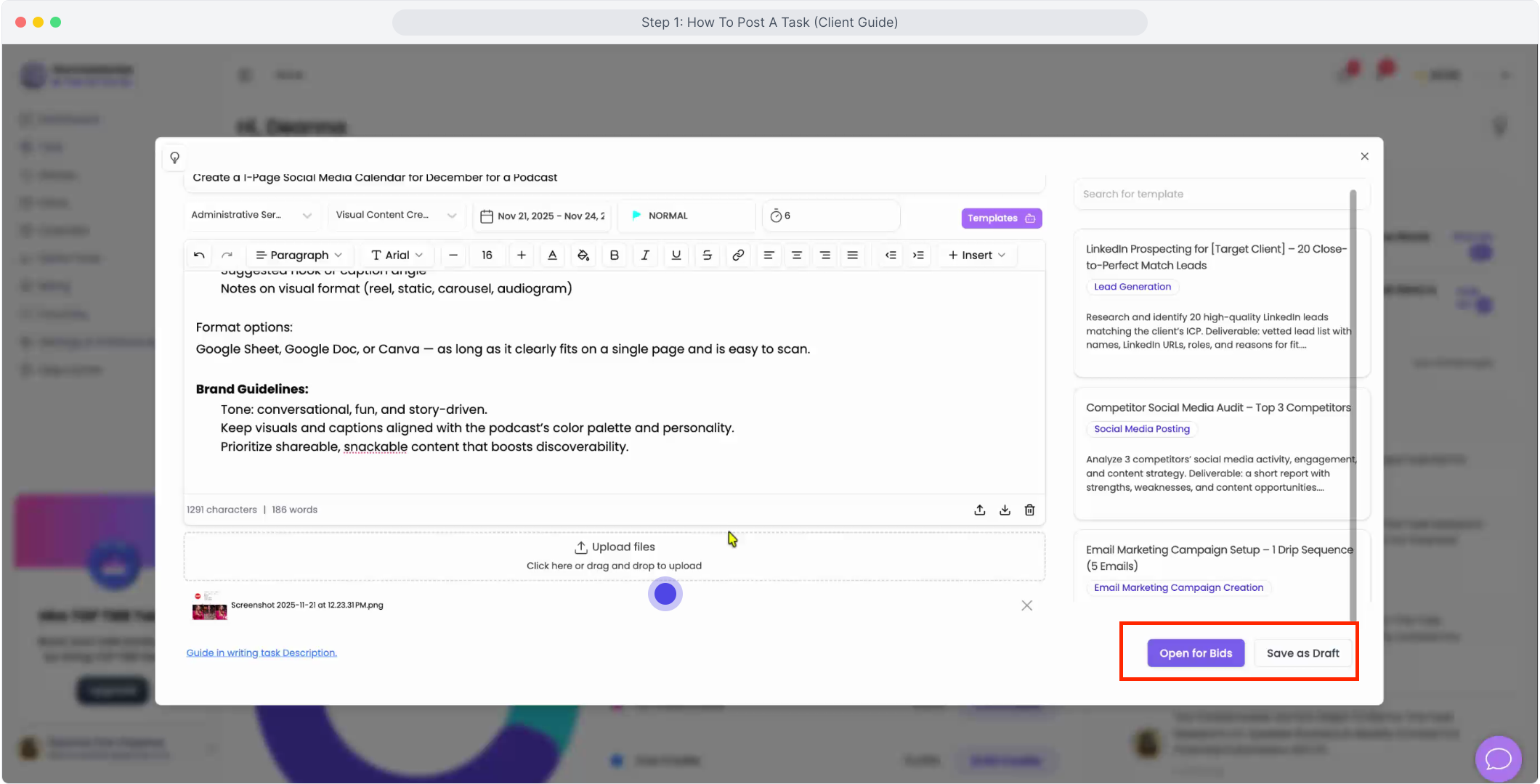 - Open for Bids β publish the task so qualified Genies can submit their bids.