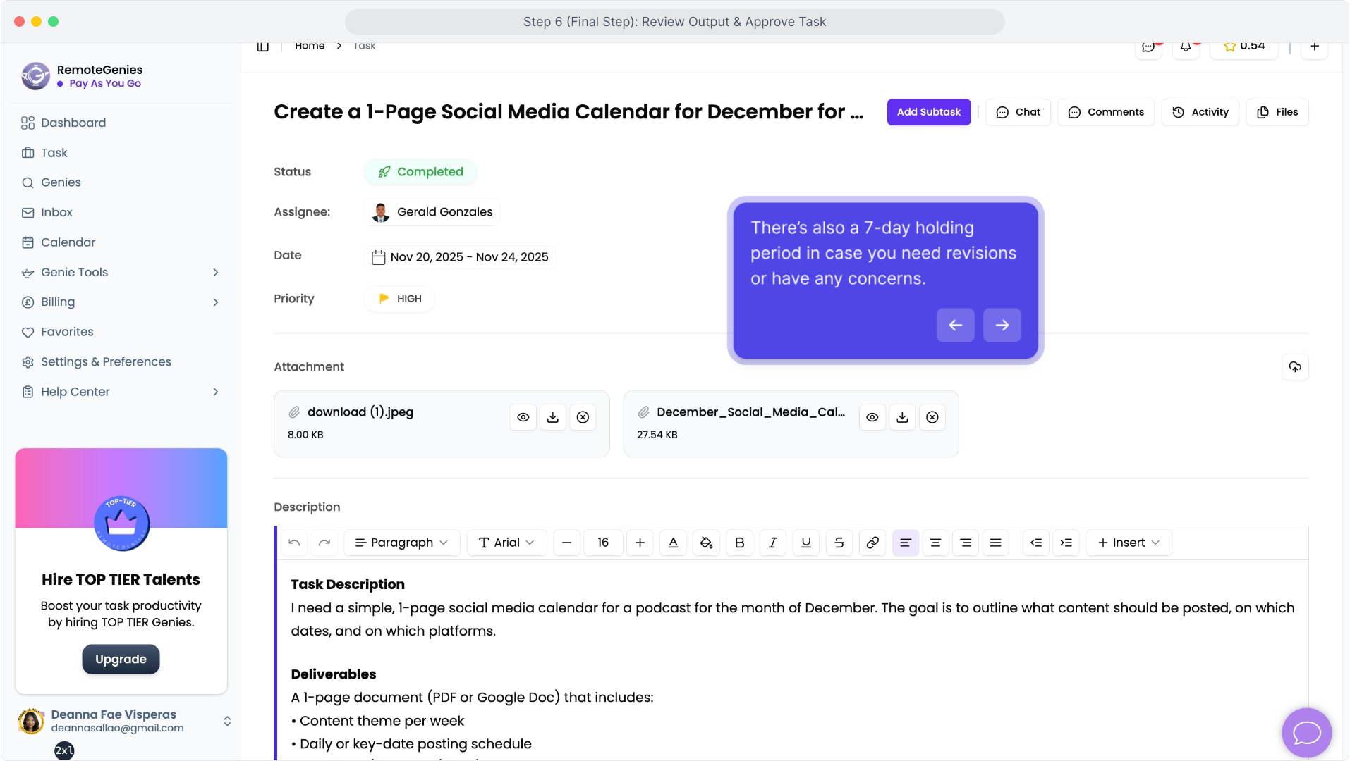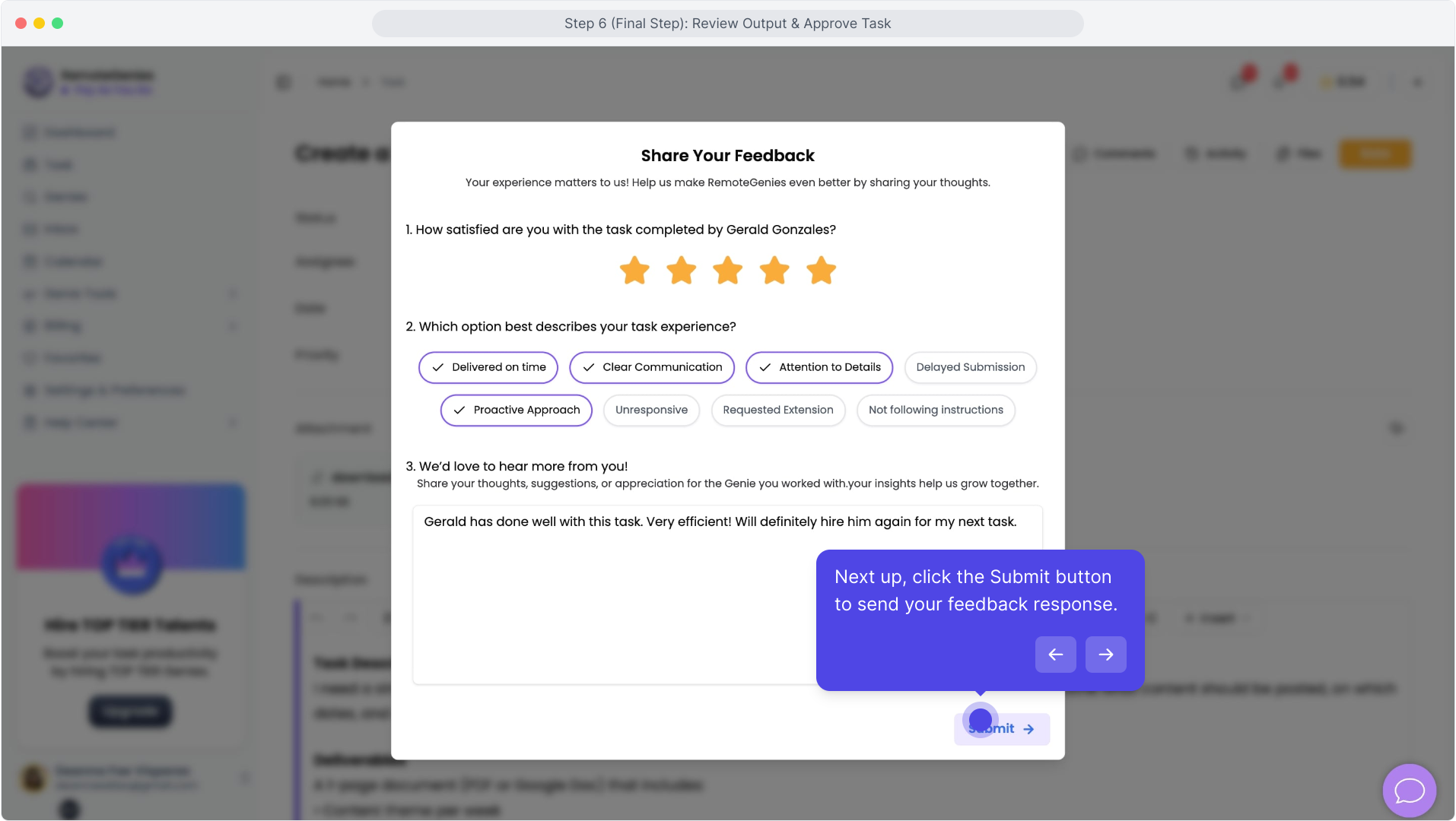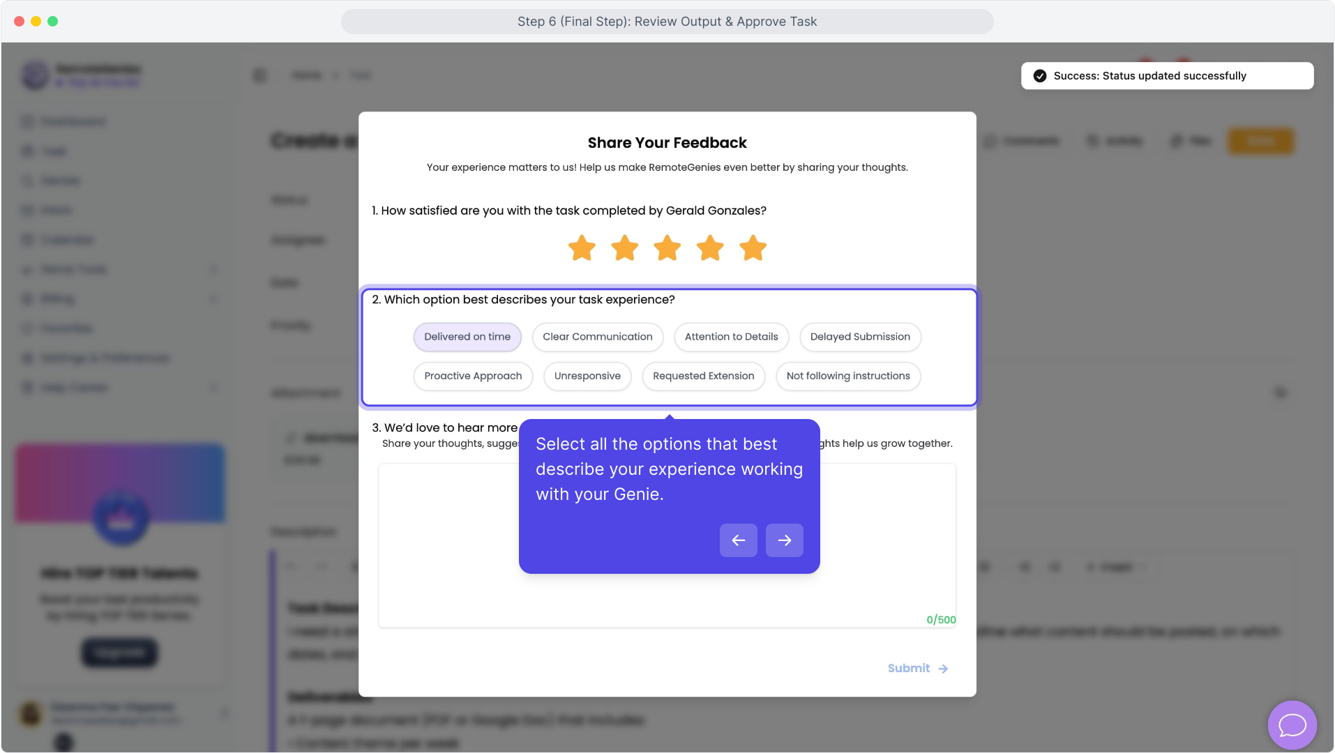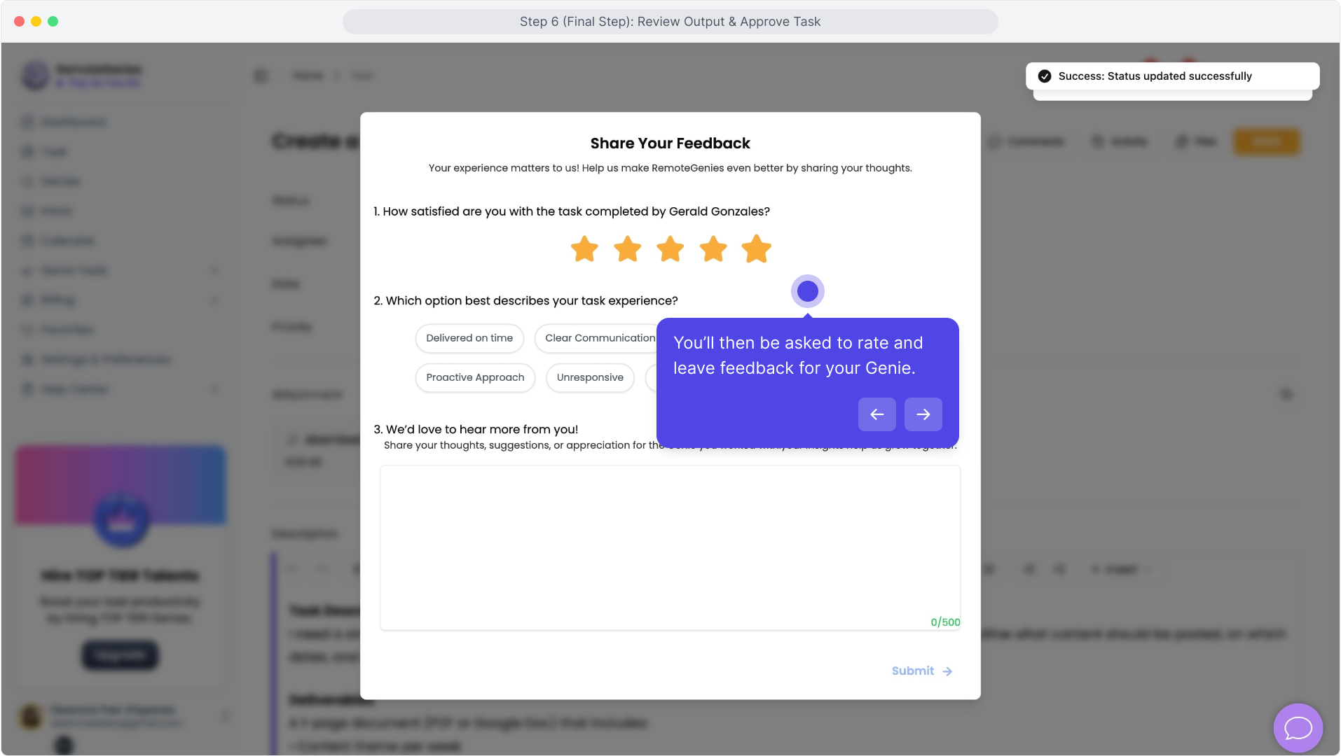 Once your task has been moved to Completed status, you’ll be prompted to leave feedback about your experience with your Genie. This helps maintain quality standards on RemoteGenies and ensures both clients and Genies receive constructive feedback.