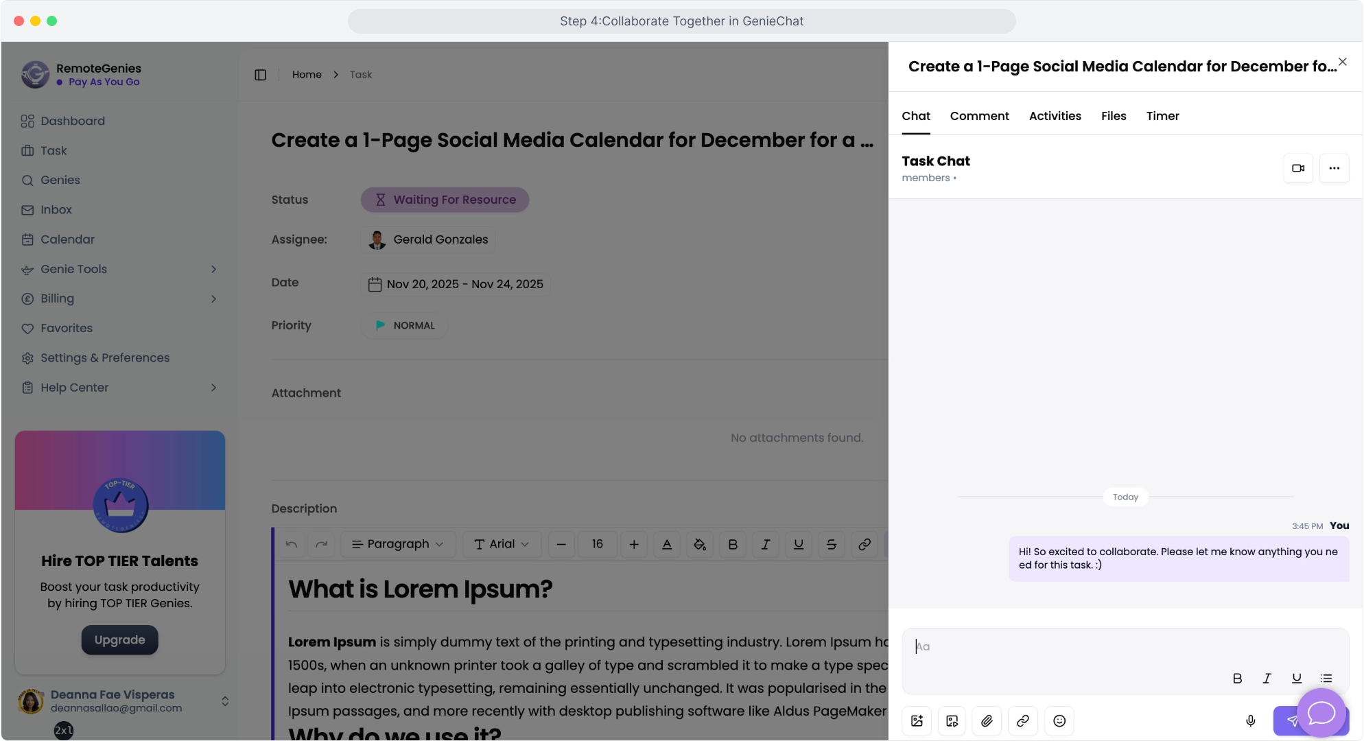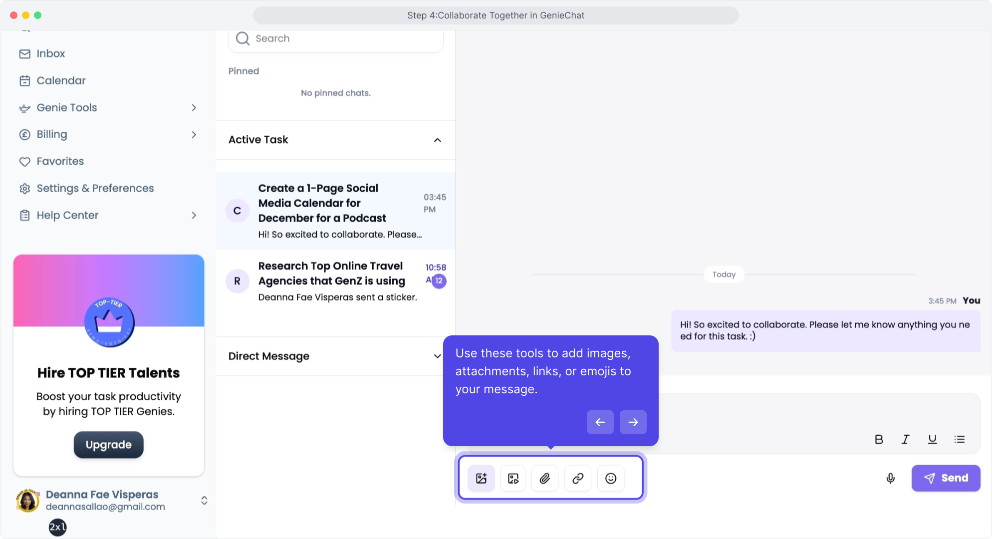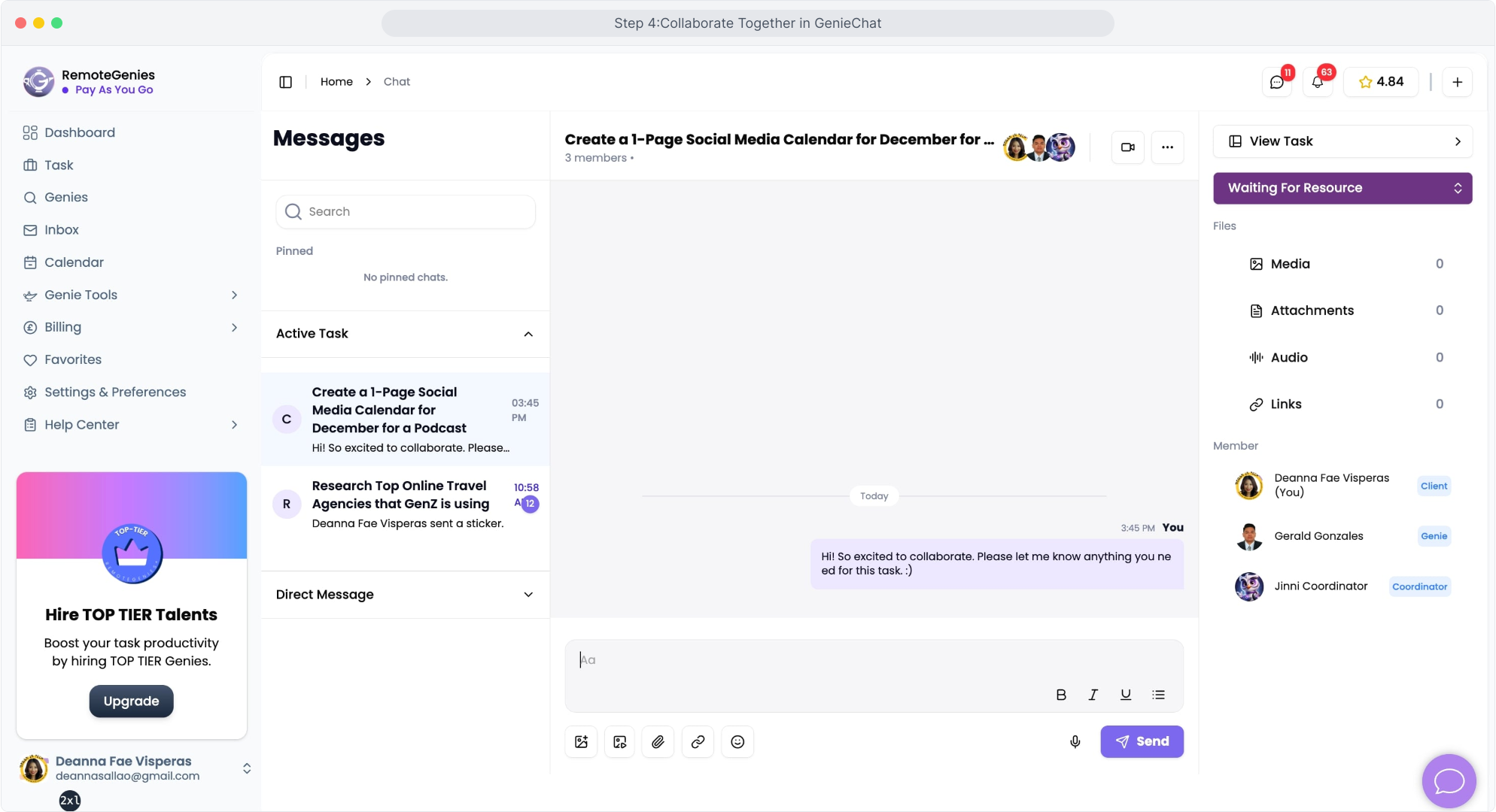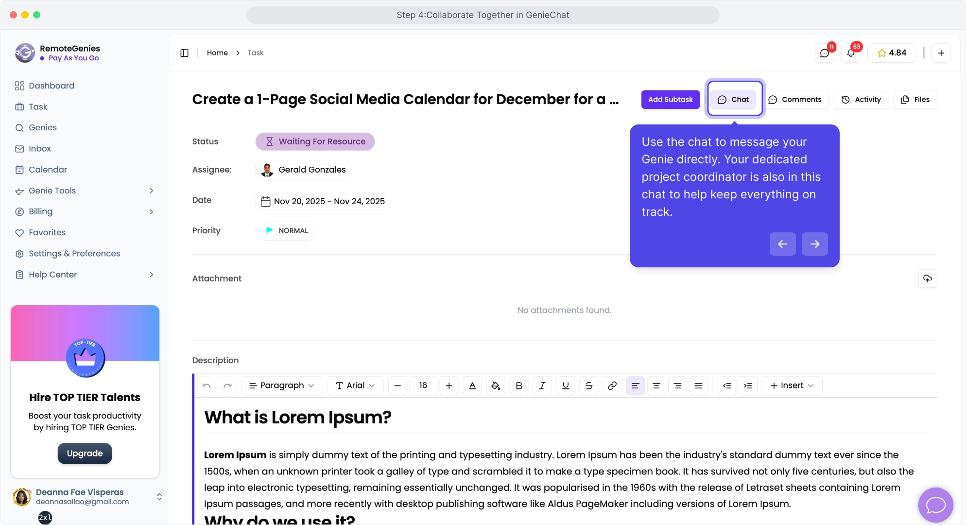GenieChat is where you work directly with your Genie and your dedicated project coordinator. This is where communication, updates, files, and progress all stay organized in one place.
