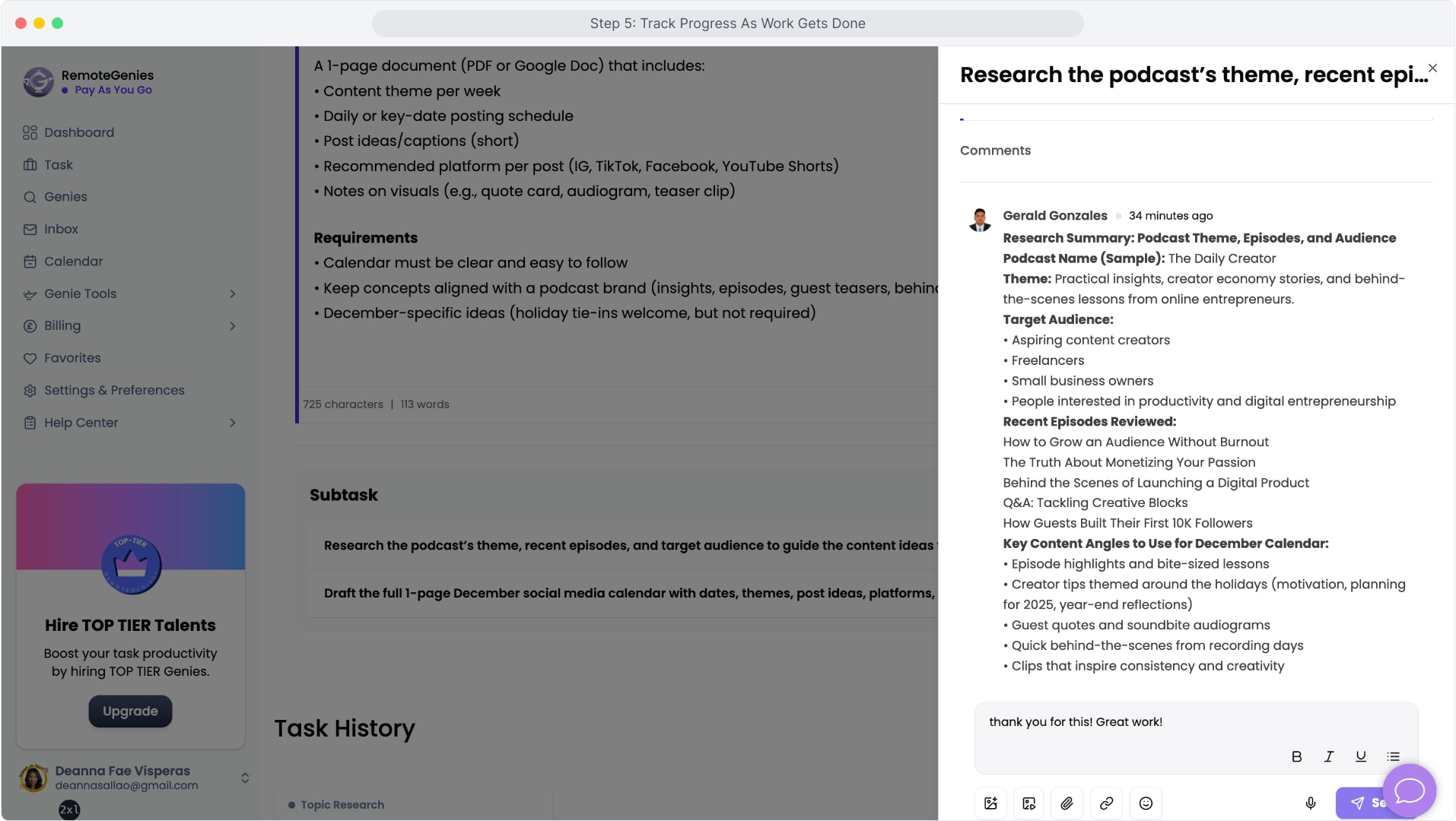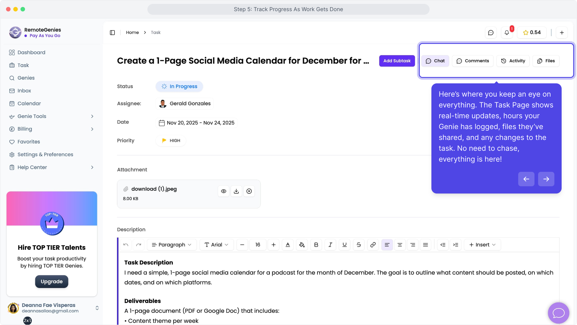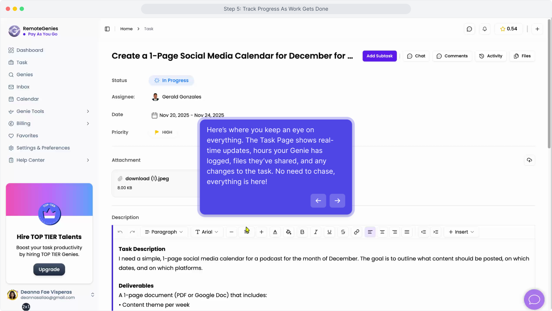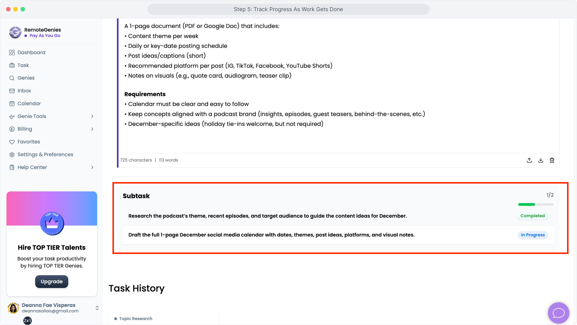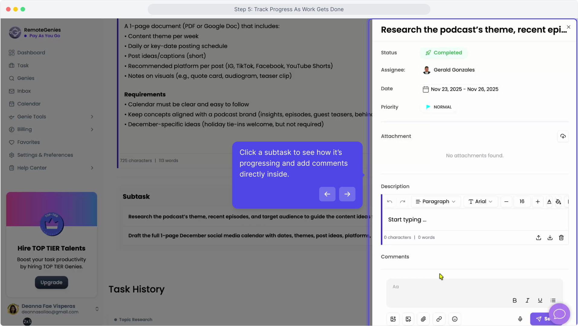 Your Task Page is where you’ll see everything happening in real time: updates, hours logged, files shared, subtask progress, and more. This step shows how to monitor all activity while your Genie works.