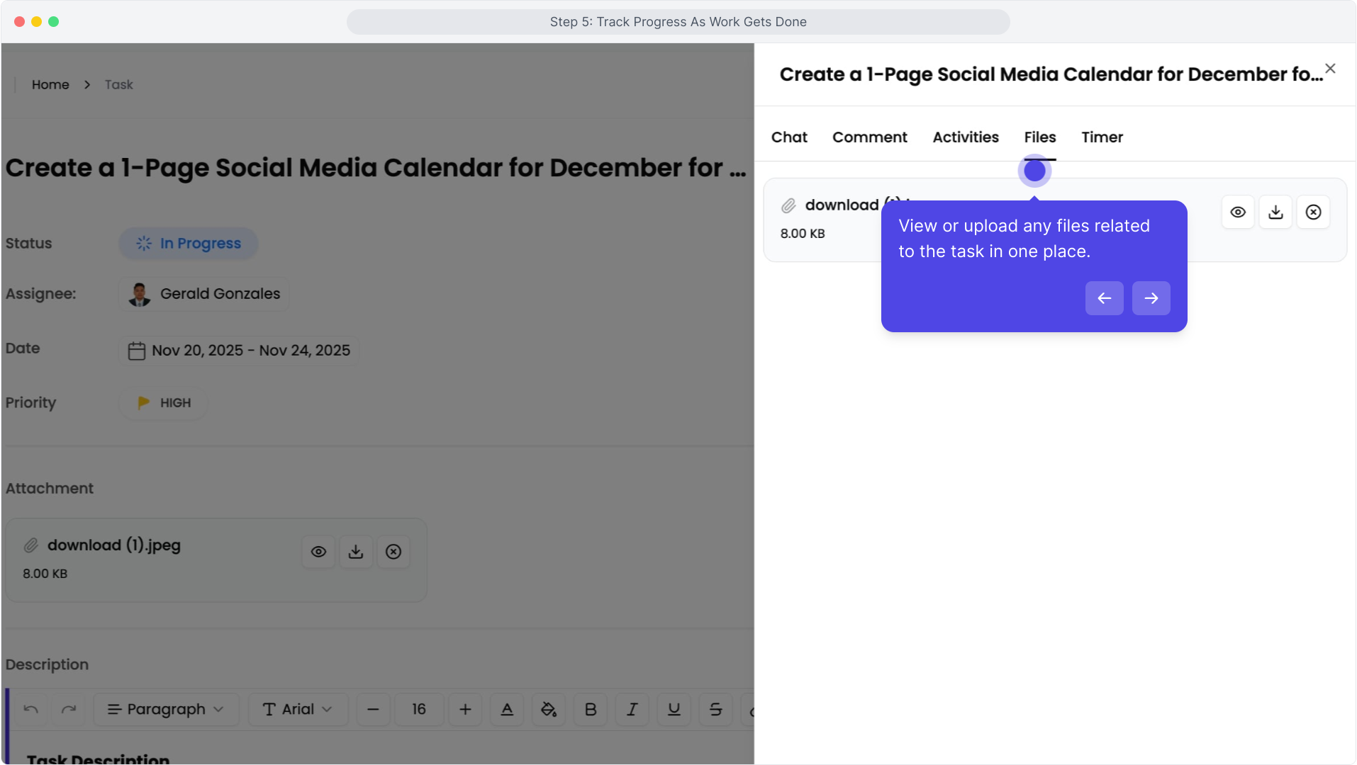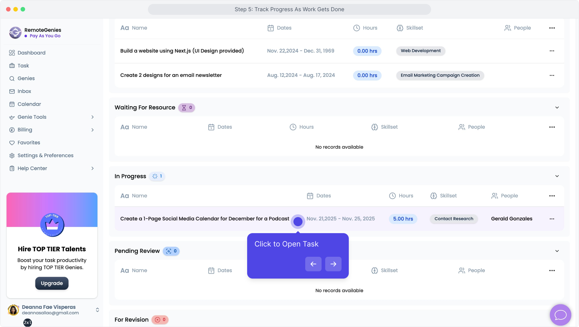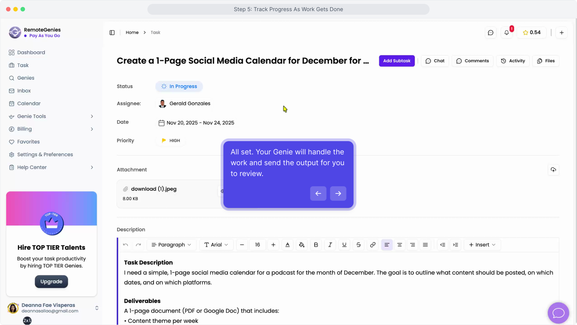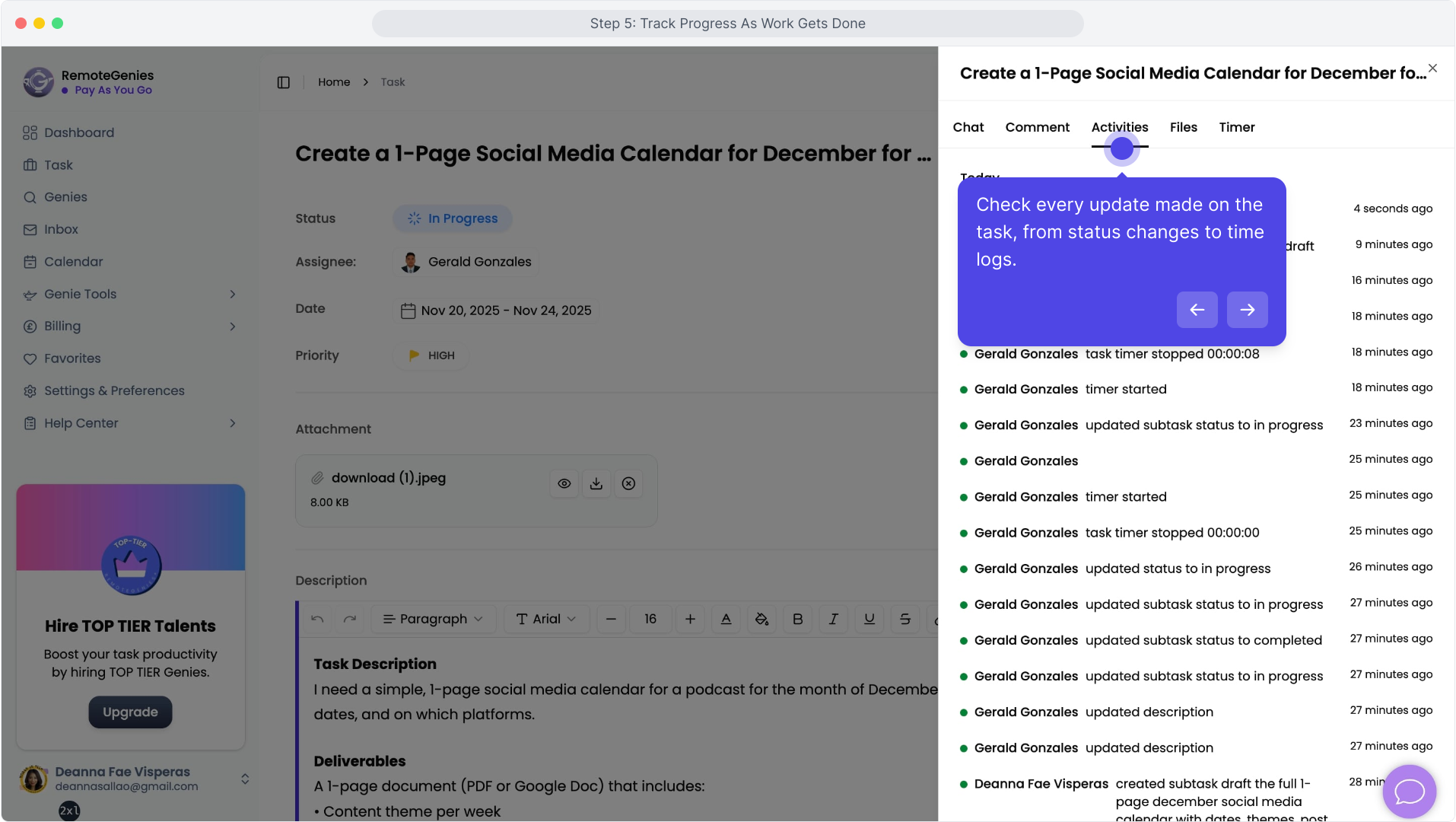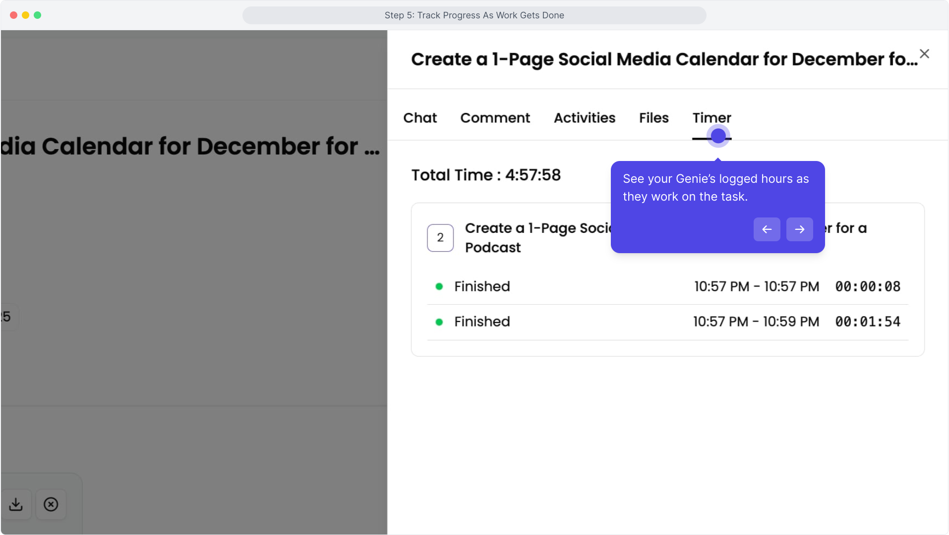 Your Task Page is where you’ll see everything happening in real time: updates, hours logged, files shared, subtask progress, and more. This step shows how to monitor all activity while your Genie works.