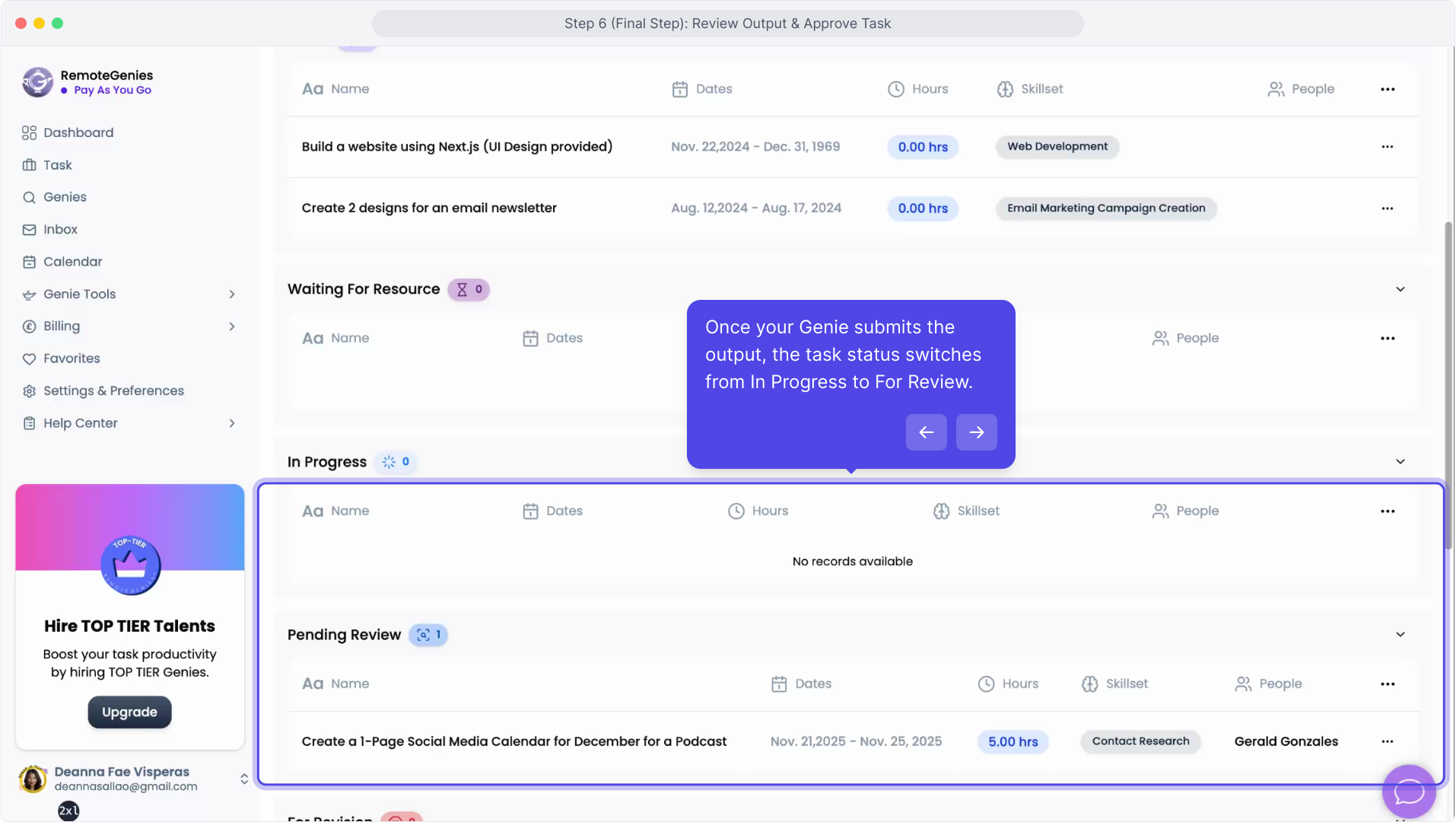 After your Genie uploads the output, the task status automatically switches from In Progress to Pending Review.