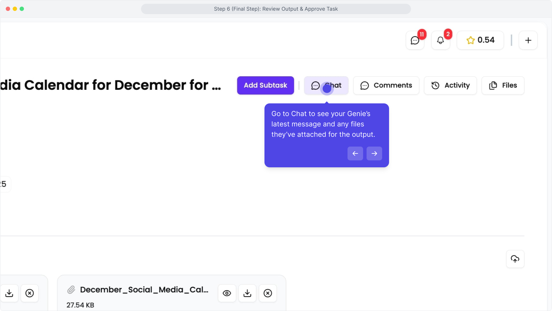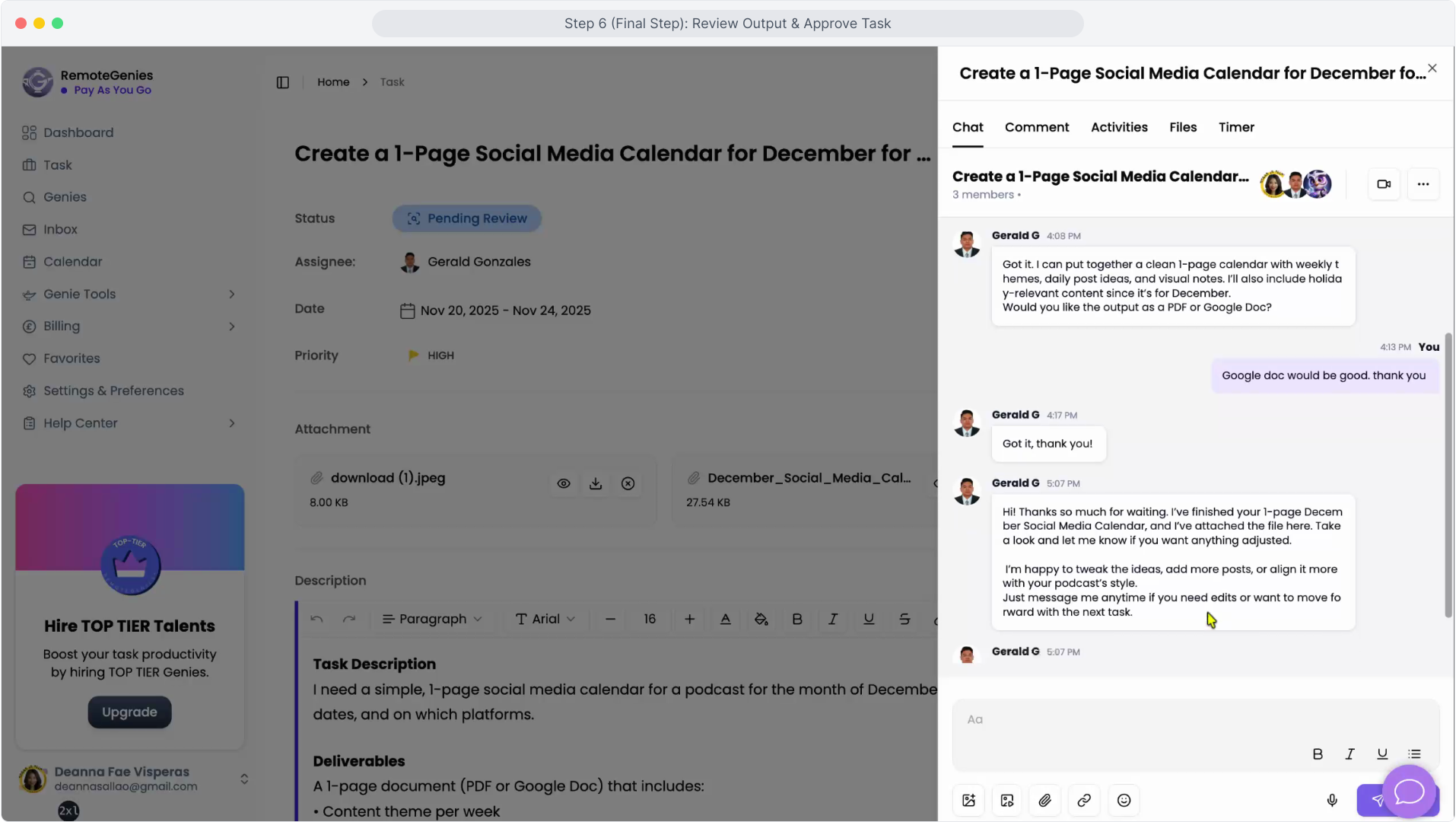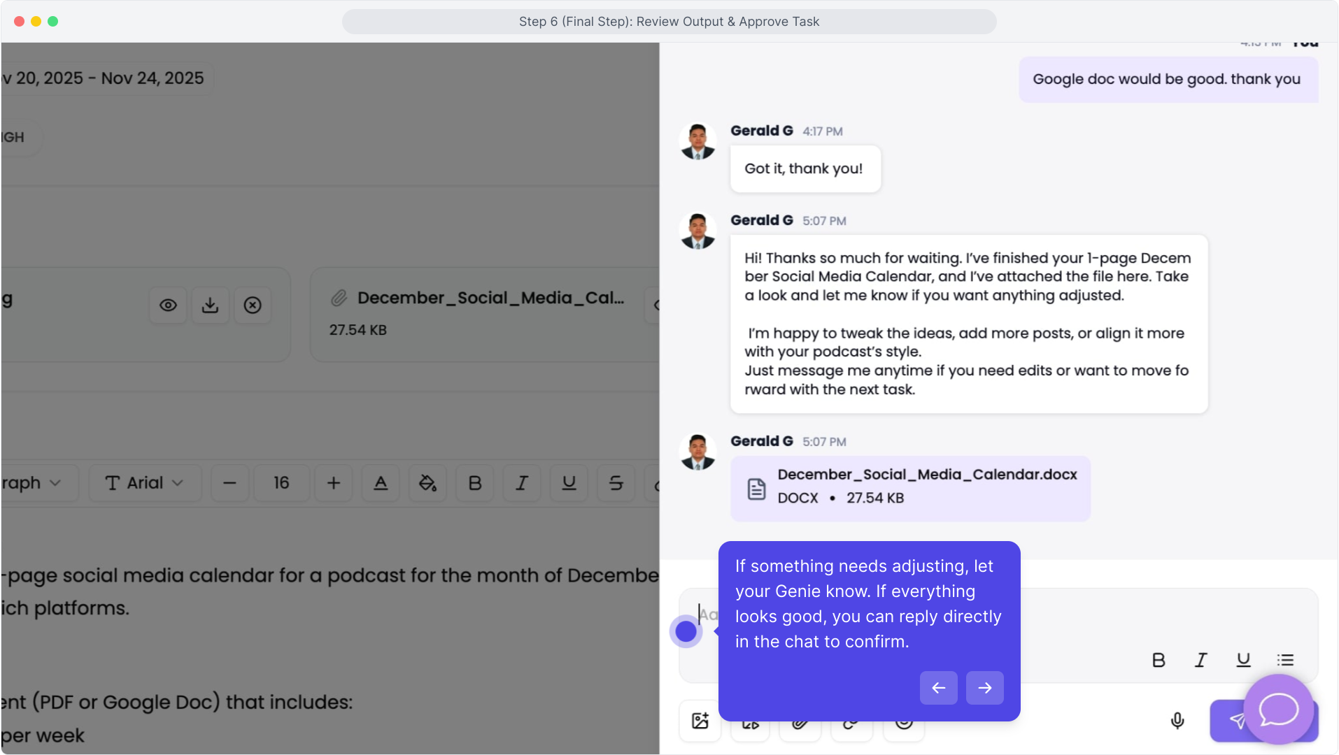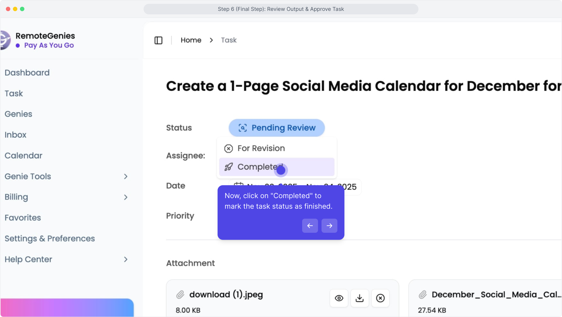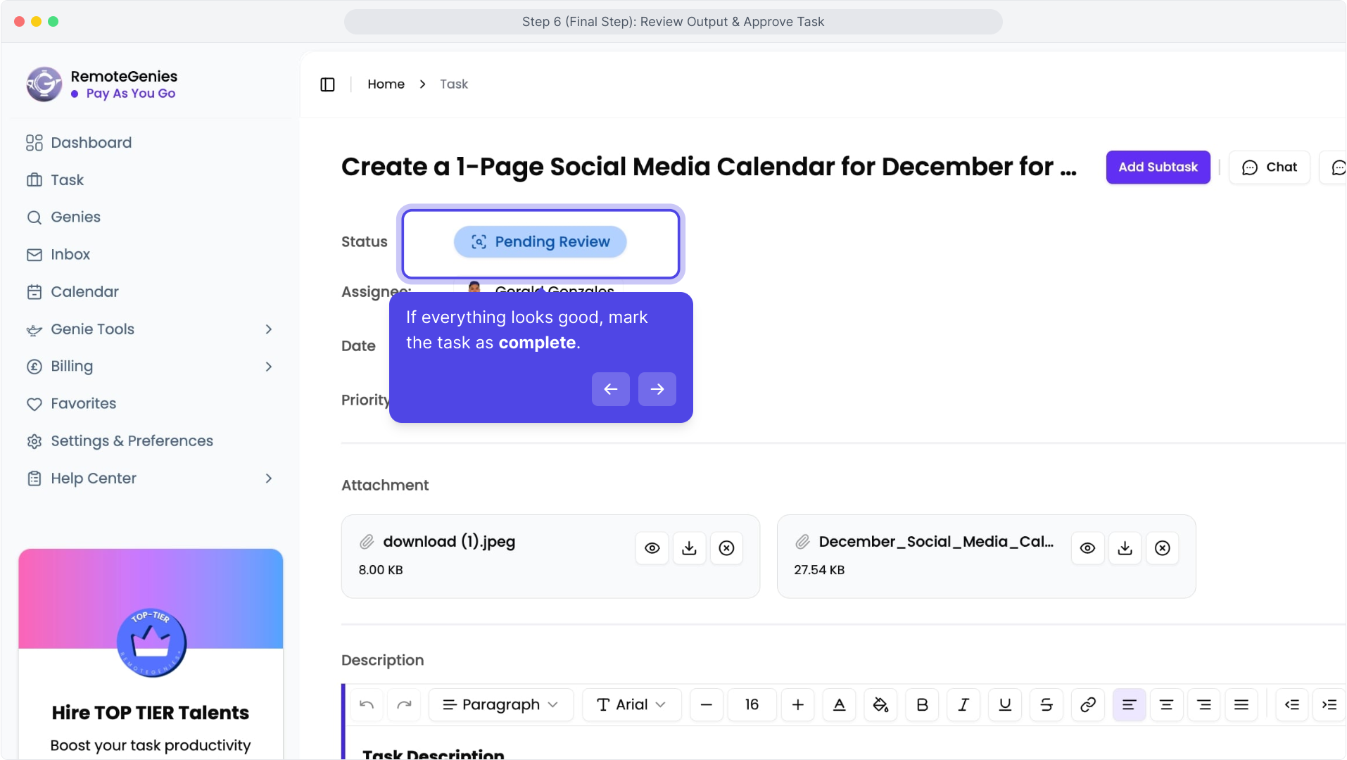 This is where you check the Genie’s final work, request revisions if needed, and mark the task as complete. A 7-day holding period applies once the task is completed, in case disputes or revisions come up.